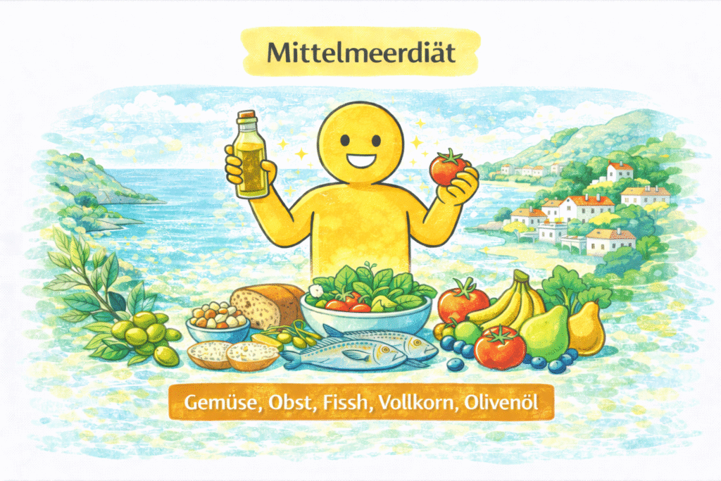 Die Mittelmeerdiät gehört zu den bekanntesten und beliebtesten Ernährungsformen der Welt. Sie basiert auf der traditionellen Ernährung der Menschen in Ländern rund um das Mittelmeer, zum Beispiel in Griechenland, Italien oder Spanien. Viele Menschen interessieren sich für diese Ernährungsweise, weil sie nicht nur beim Abnehmen helfen kann, sondern auch als besonders gesund und ausgewogen gilt. Statt strenger Regeln oder Verbote steht bei der Mittelmeerdiät eine natürliche und abwechslungsreiche Ernährung im Mittelpunkt. Typisch für diese Ernährung sind viel Gemüse, frisches Obst, Fisch, Olivenöl und Vollkornprodukte. Stark verarbeitete Lebensmittel werden dagegen eher selten gegessen.