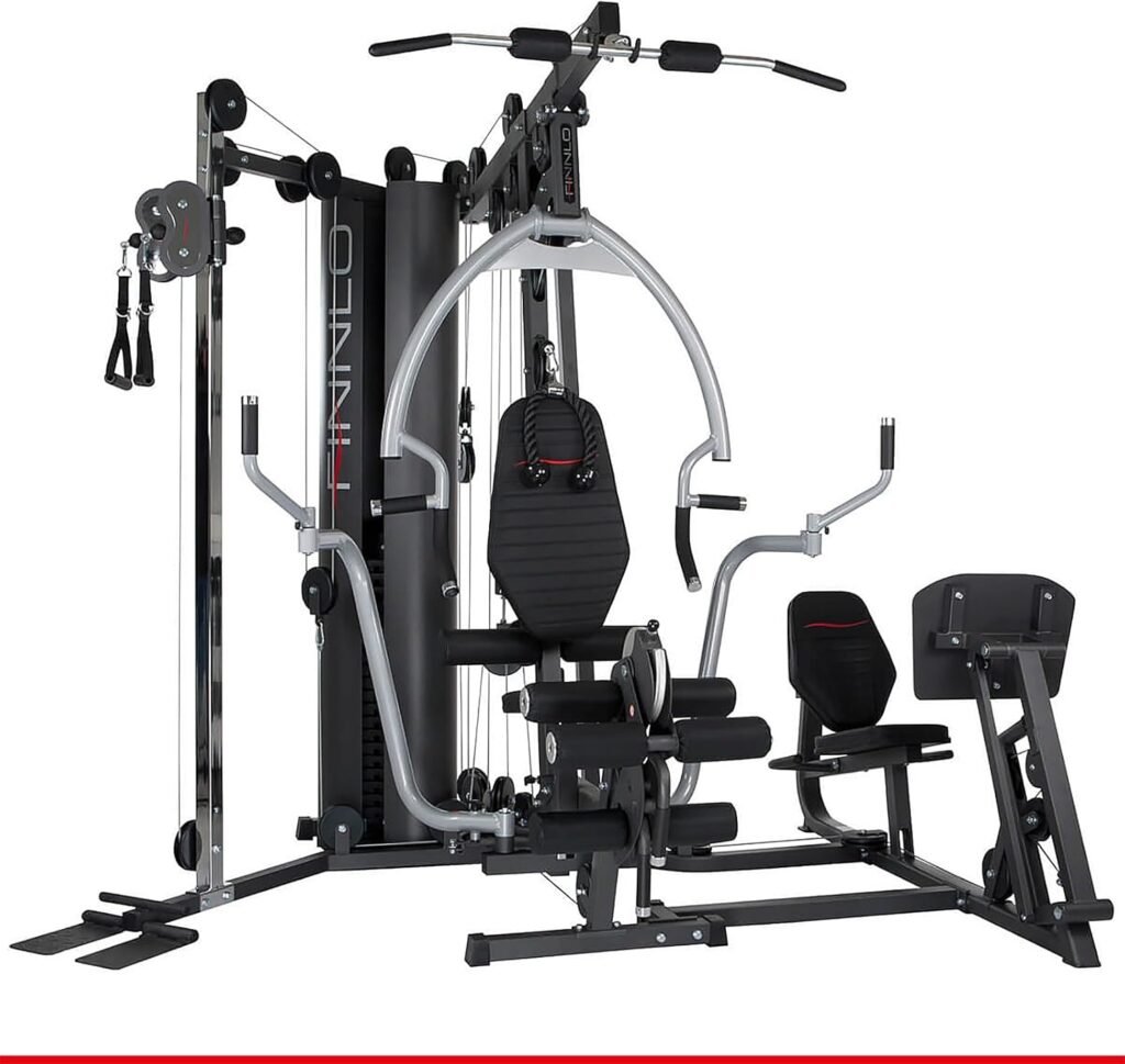 Der FINNLO by HAMMER Kraftstation Autark 6800 ist eine professionelle Heim-Kraftstation, die nahezu alle Muskelgruppen wie im Fitnessstudio trainierbar macht. Mit einem Gewichtsstapel von 100 kg (20 × 5 kg) bietet sie ausreichend Widerstand, selbst für fortgeschrittene Nutzer. Das Gerät enthält eine integrierte Beinpressen-Einheit, ein Beinstrecker/-beuger-Modul sowie eine separat verstellbare Butterfly-Einheit. Ein seitliches Seilzugmodul mit um 160 ° schwenkbarer und höhenverstellbarer Rollenführung ermöglicht vielfältige Übungsvarianten – etwa Rudern, Latziehen oder Trizeps-Curls. Sitz und Rückenlehne sind mehrfach verstellbar, sodass auch größere Nutzer ergonomisch gut trainieren können. Die maximale Nutzerlast beträgt etwa 120 kg. Aufbaufläche beträgt rund 200×250×223 cm, empfohlen wird ein Platzbedarf von etwa 212×350×223 cm. Die solide Stahlrahmenkonstruktion und qualitativ hochwertige Komponenten machen die Autark 6800 zu einer hochwertigen Wahl für ambitioniertes Krafttraining zuhause.