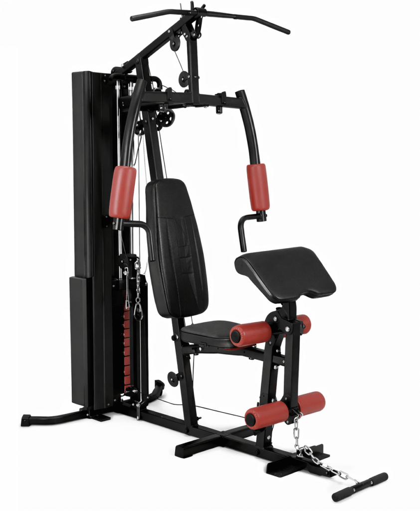 Die Ausstattung umfasst u. a. Brustpresse/Butterfly, Latzug, Beinstrecker und eine Bizeps-/Trizeps-Station, wodurch Brust, Rücken, Arme, Schultern und Beine gezielt trainiert werden können. Gepolsterte Sitz- und Rückenelemente sind höhenverstellbar, damit die Station ergonomisch auf verschiedene Körpergrößen angepasst werden kann. Nutzer-Maximalgewicht liegt bei bis zu etwa 125 kg; das Eigengewicht des Geräts beträgt rund 115 kg. Mit dieser Kraftstation erhältst du ein platzsparendes, gut ausgestattetes Trainingstool für den Heimgebrauch, das viele Übungen in einem Gerät bündelt.